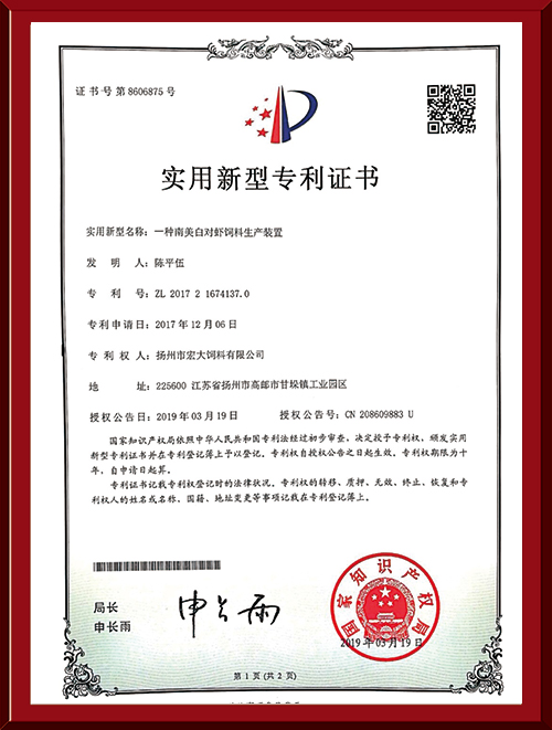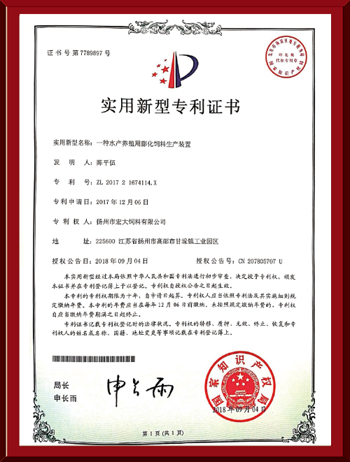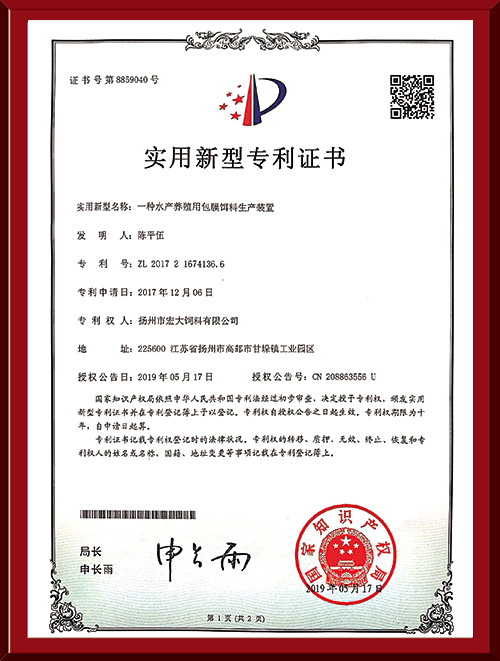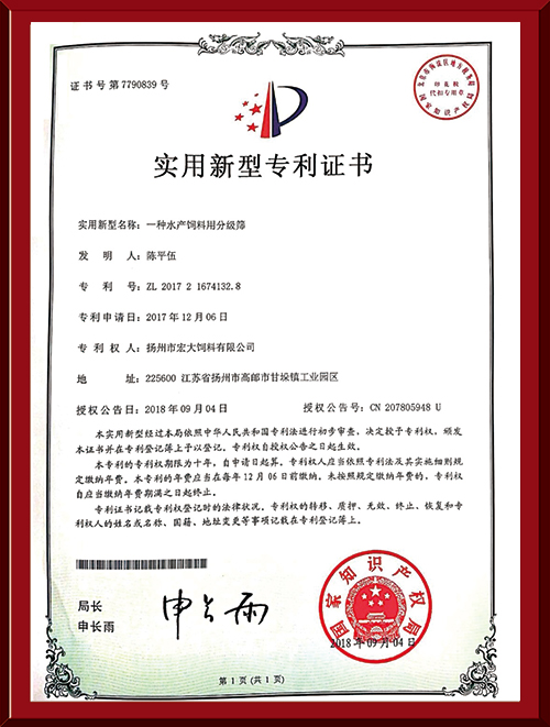揚州市宏大飼料有限公司 揚州市宏大飼料有限公司是一家集科研與生產(chǎn)為一體的大型民營企業(yè),座落在魚米之鄉(xiāng)高郵東郊,傍依郵興公路、澄子河,水陸交通便捷,于2002年建成投產(chǎn),占地面積60畝,固定投資1.5億元?,F(xiàn)有7條生產(chǎn)線,其中時產(chǎn)15噸高檔水產(chǎn)膨化生產(chǎn)線2條,均采用國內先進的真空后噴涂技術和低溫烘干技術(飼料內的各種營養(yǎng)不受破損)、臺灣宜大高檔蝦料生產(chǎn)線2條和魚飼料生產(chǎn)線3條。